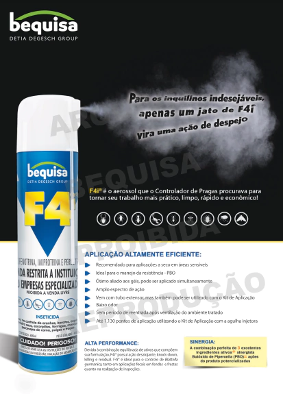 F4i é um inseticida aerossol eficaz no controle de aranhas, baratas, cupins de madeira seca, formigas, escorpiões, mosquitos, percevejos de cama, pulgas e traças.